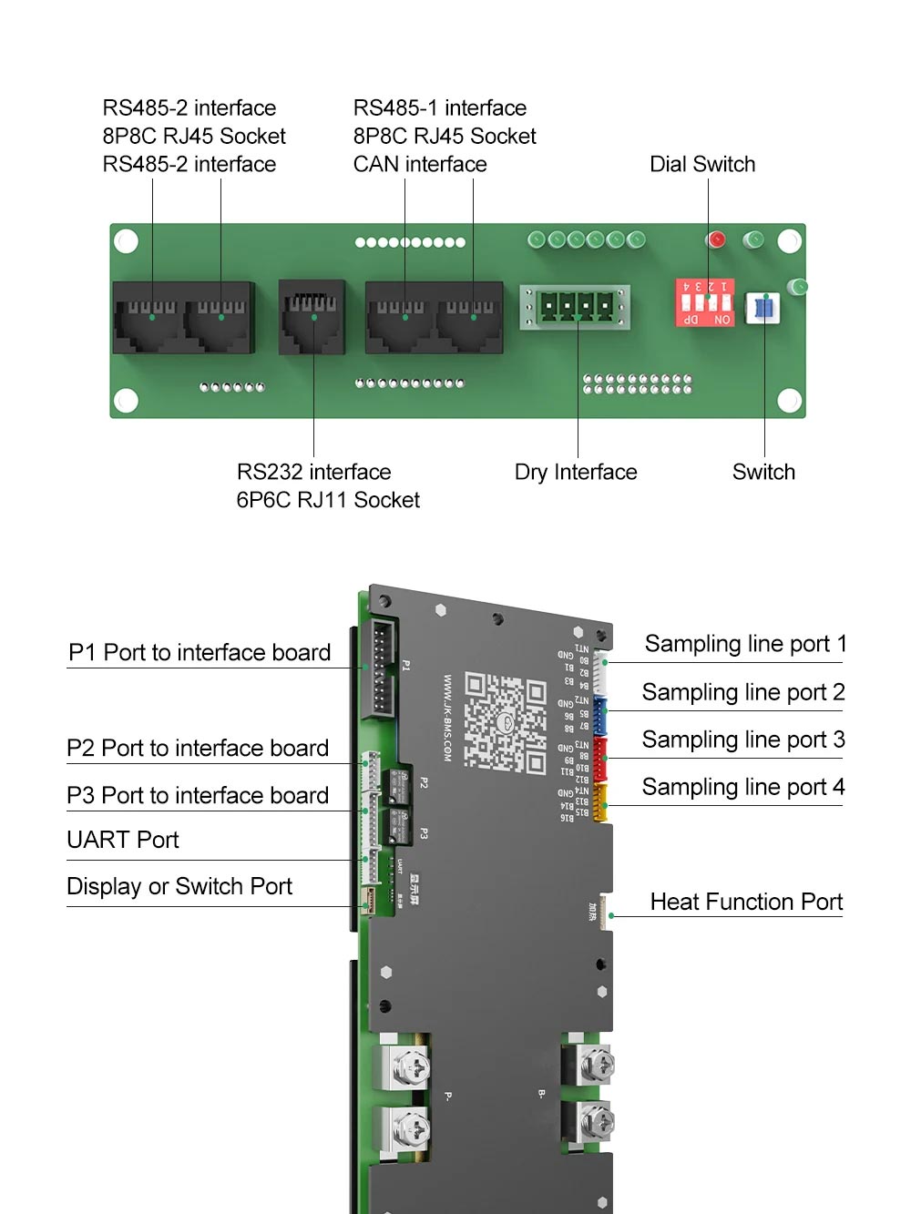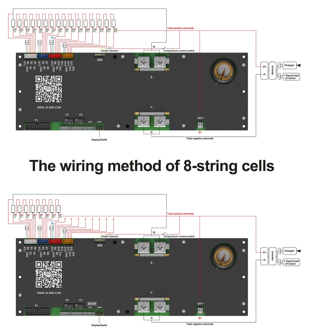 - Комплектація: плата JK-PB2A16S20P, комунікаційна плата зі світлодіодною індикацією, кнопка зі світлодіодною індикацією, балансувальні дроти з роз'ємом і датчиком температури (4 шт), шлейфи для з'єднання плати BMS з комунікаційною, кабель для роз'ємів RS232, RS485, CAN, кабель для під'єднання нагрівання елементів акумулятора, провід живлення плати BMS